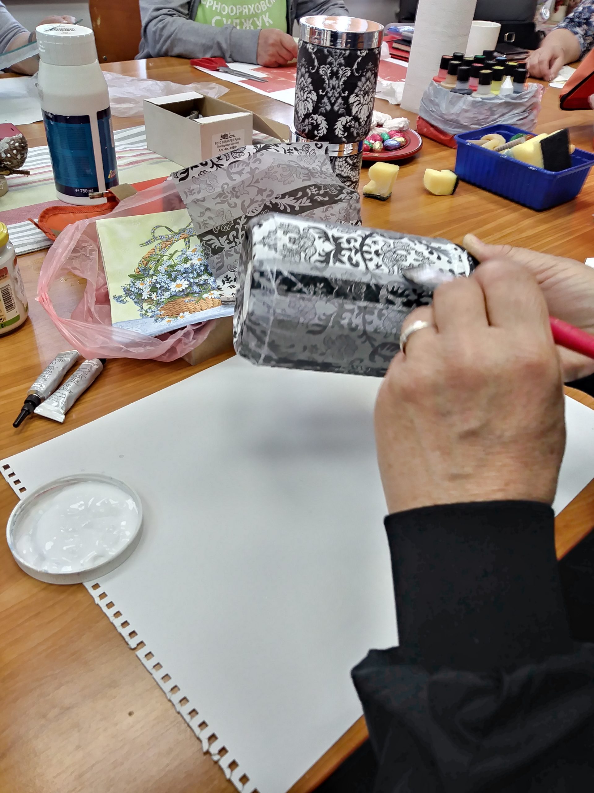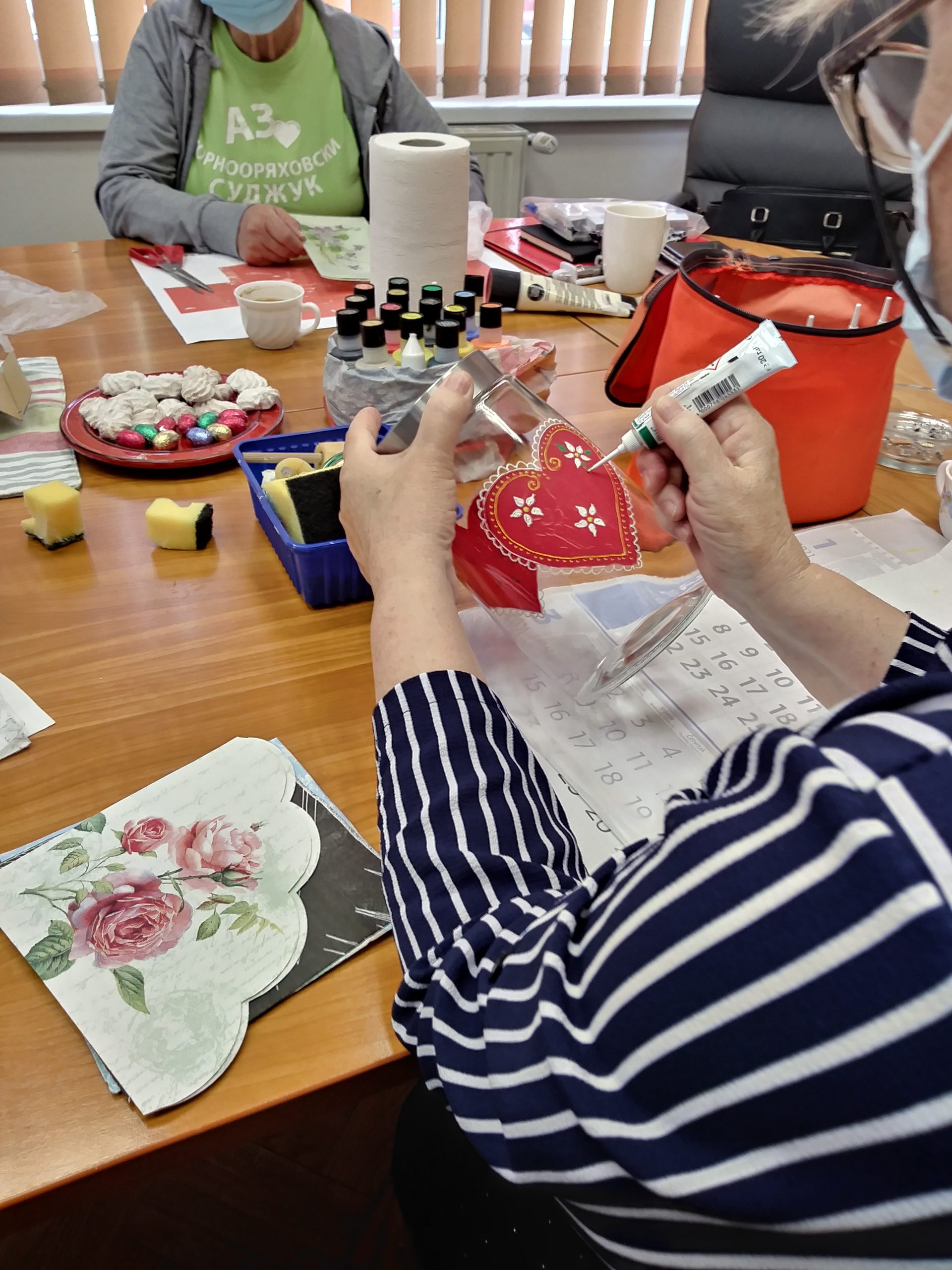 Na kreativnoj radionici polaznici su ponavljali postupak izvođenja dekupaža na drvenim i staklenim podlogama. Polaznici su završavali ukrase izrađene tehnikom dekupaž te ih stavljali na sušenje koje traje 12 sati. Koristeći akrilne boje za staklo na bazi vode, popunjavali su dosad napola izrađene ukrase, koristeći staklene posude, staklene zdjele te staklenke. Za dekupaž na staklenim podlogama koristili su akrilne boje na bazi vode i spužve.