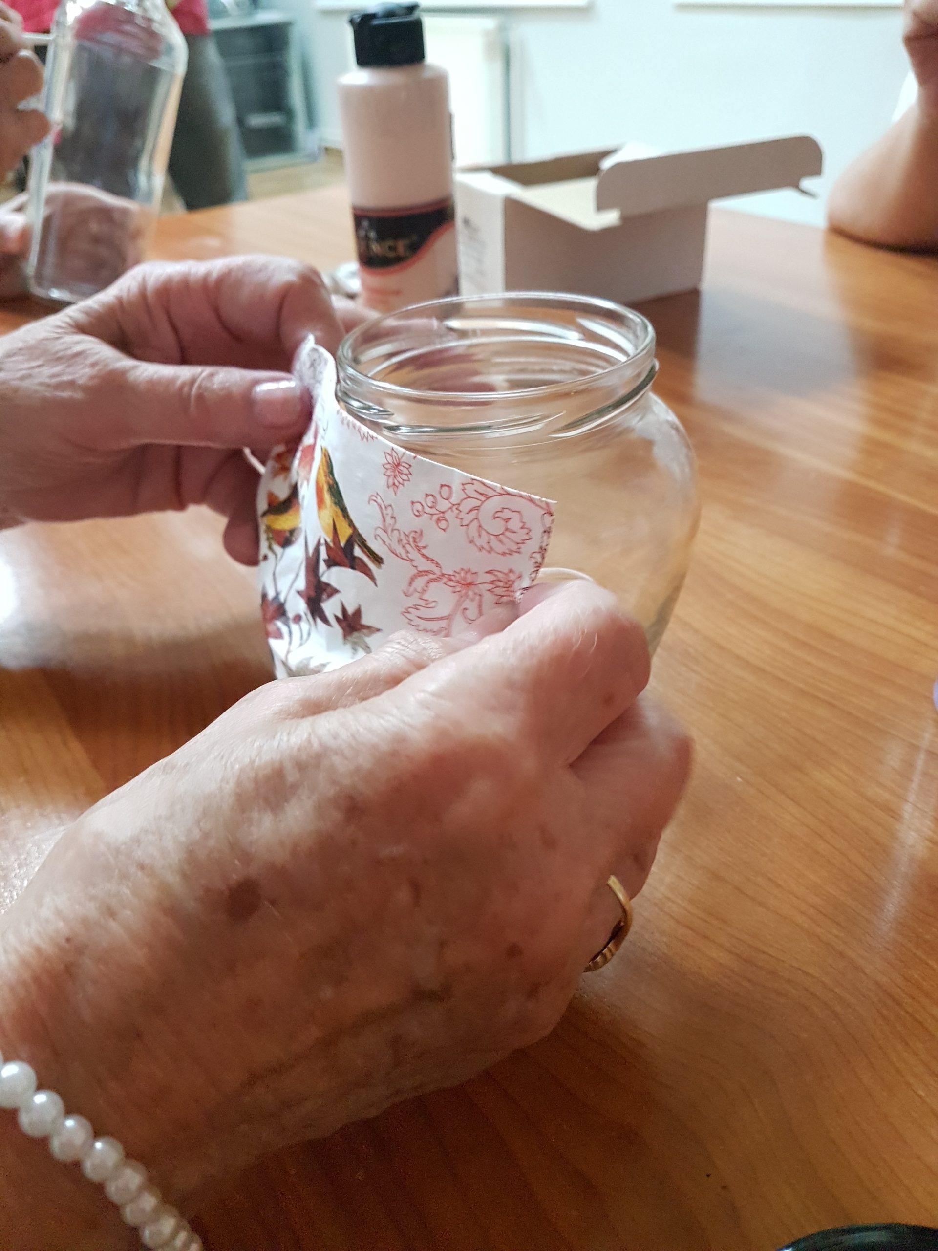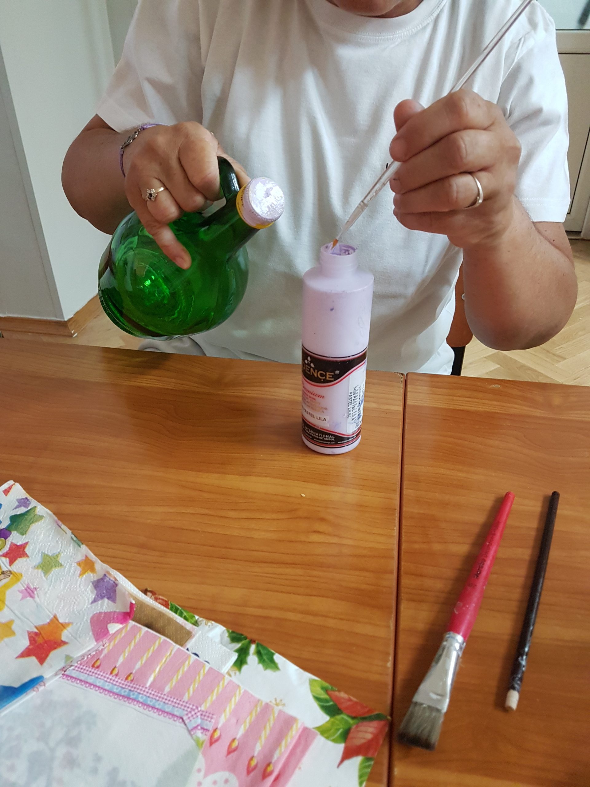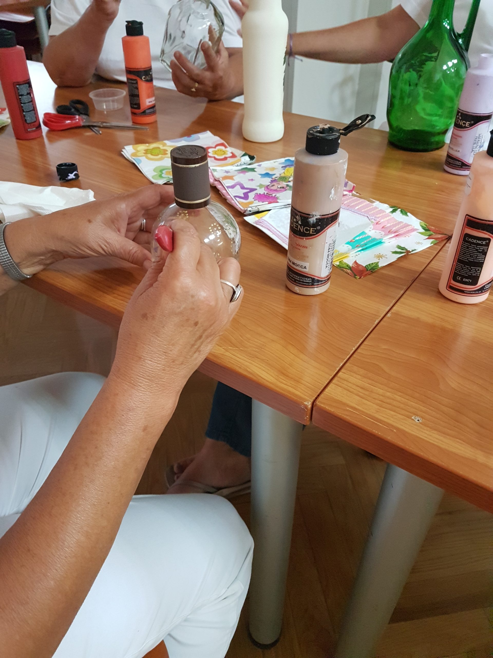 Kreativna radionica započela je razvrstavanjem izrezanih motiva za tehniku dekupaž te slaganjem potrebnih akrilnih boja. Polaznici su započeli crtati na staklu, a ostali su pripremali podloge za tehniku dekupaž. Polaznicima je jednostavnije raditi tehniku dekupaž na staklenim podlogama pa su iste sami pripremili. Radionica je održana uz pridržavanje svih epidemioloških mjera i odredbi propisane socijalne distance uz ograničen broj polaznika.
