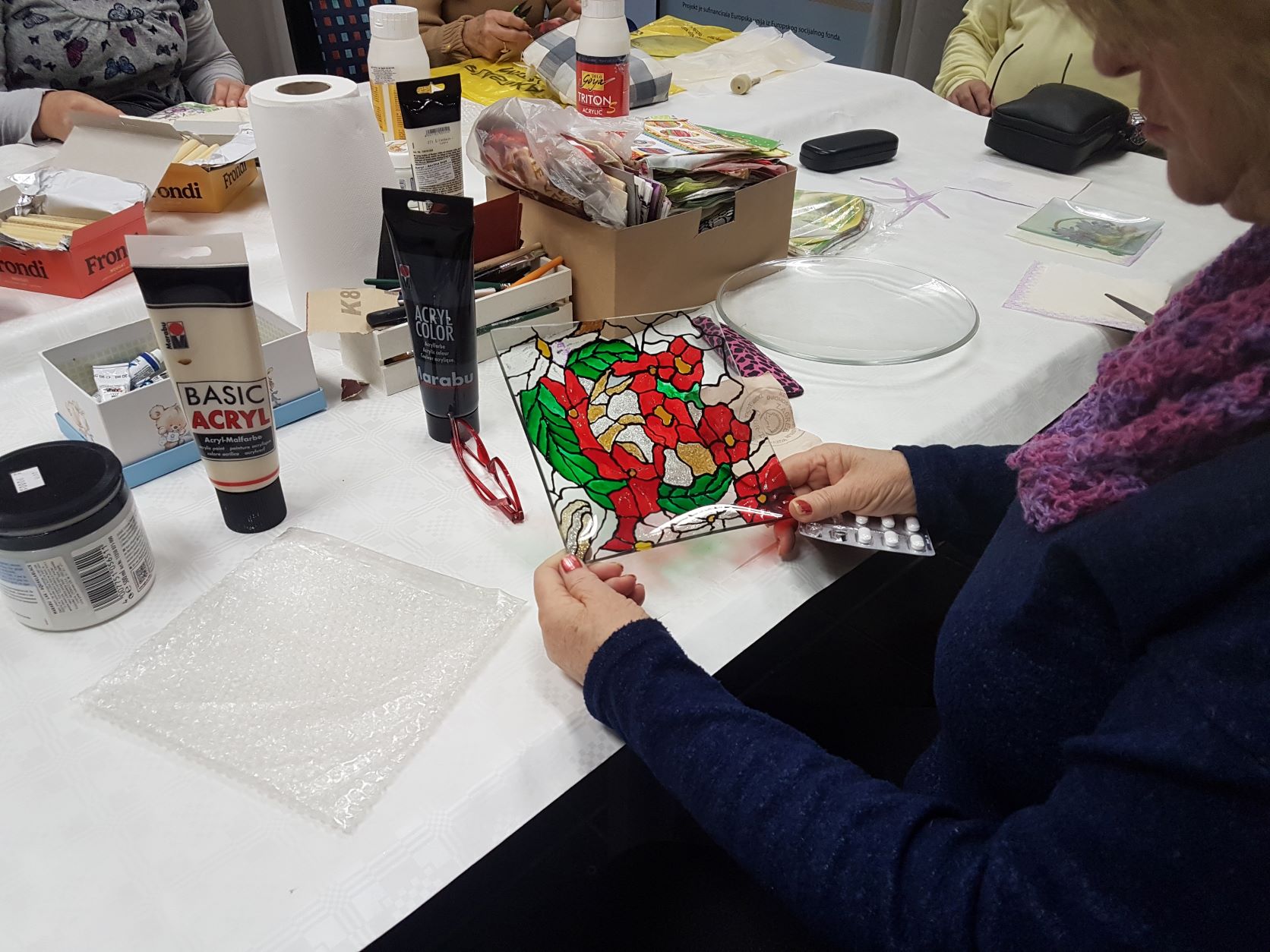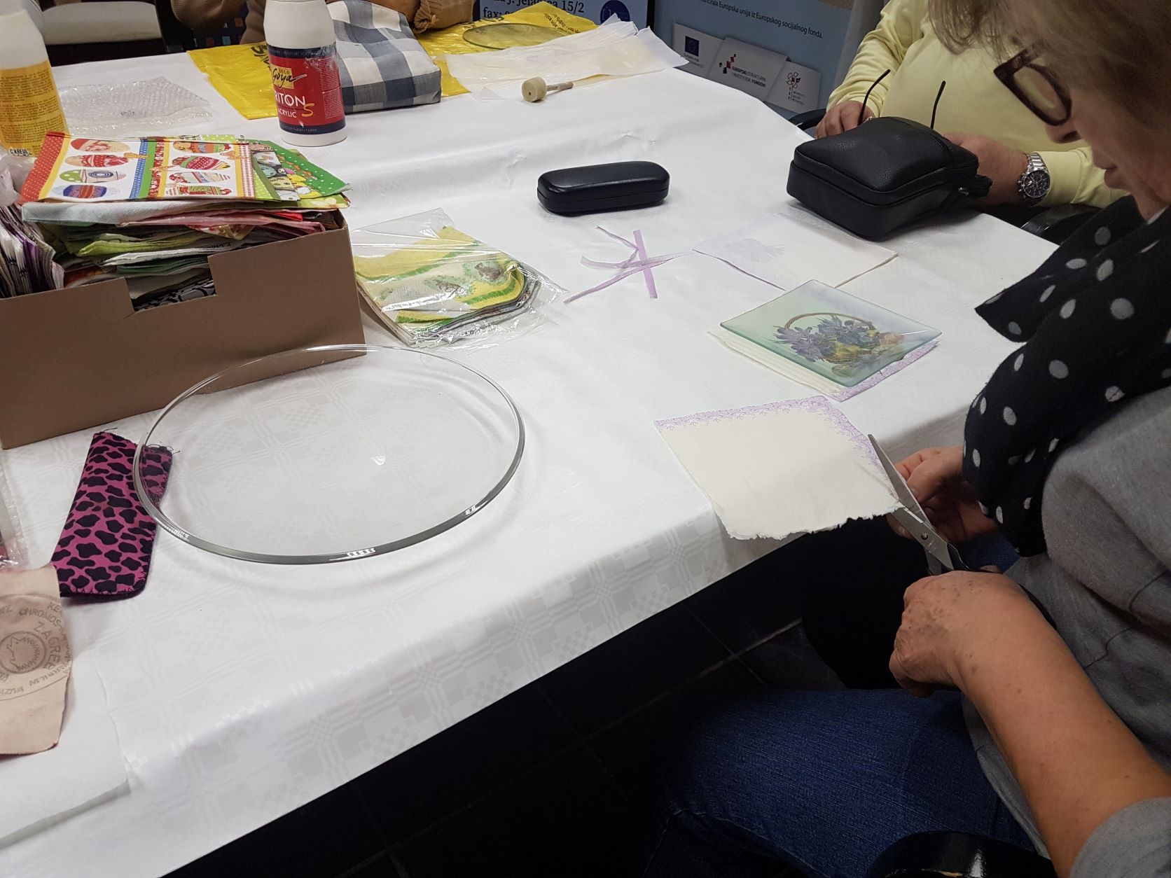 Kreativna radionica započela je prisjećanjem sudionika na izradu nakita od hobi kita. Voditeljica je prikazivala postupke te su zajedno sa njome sudionici izvodili. Sudionici su zamijesili hobi kit sa vodom te dobili smjesu koju će nanositi na staklenku. Pažljivo nanošenje na staklenku obavezno je zbog stvaranja grudica koje će kasnije ukrasiti staklenku. Nakon nanošenja smjese, staklenke se stavljaju sušiti da smjesa očvrsne te da mogu nastaviti izradu.
