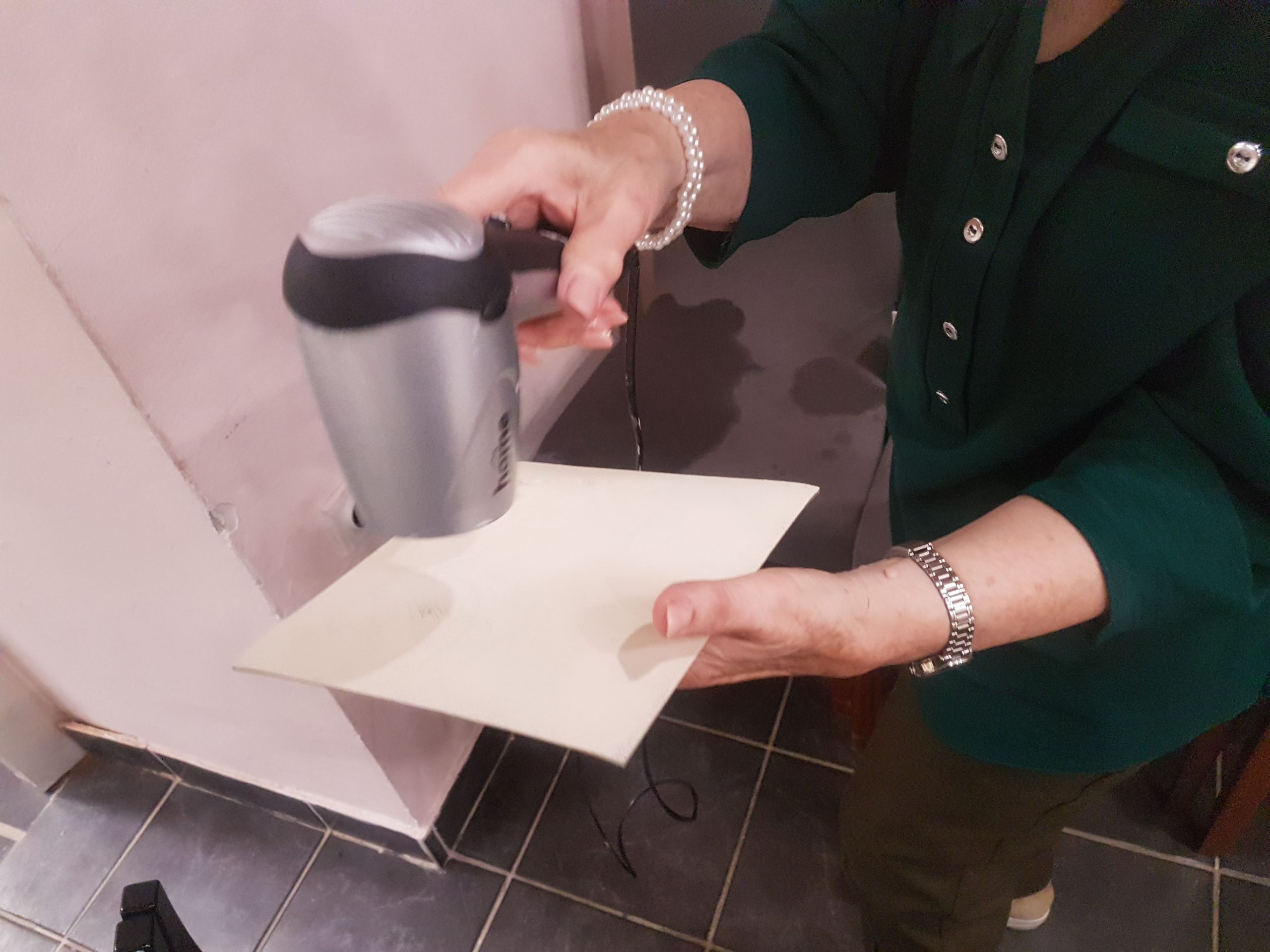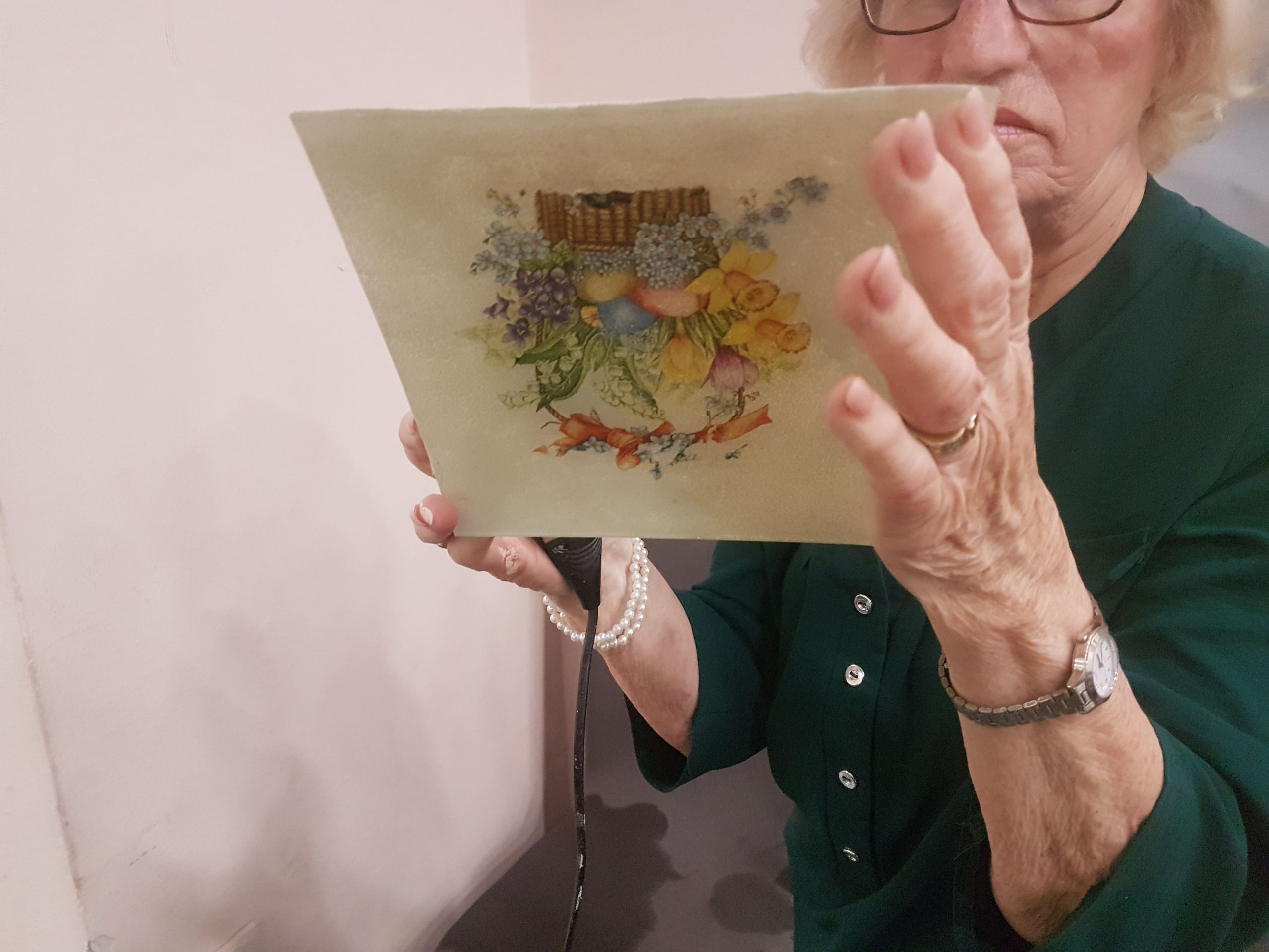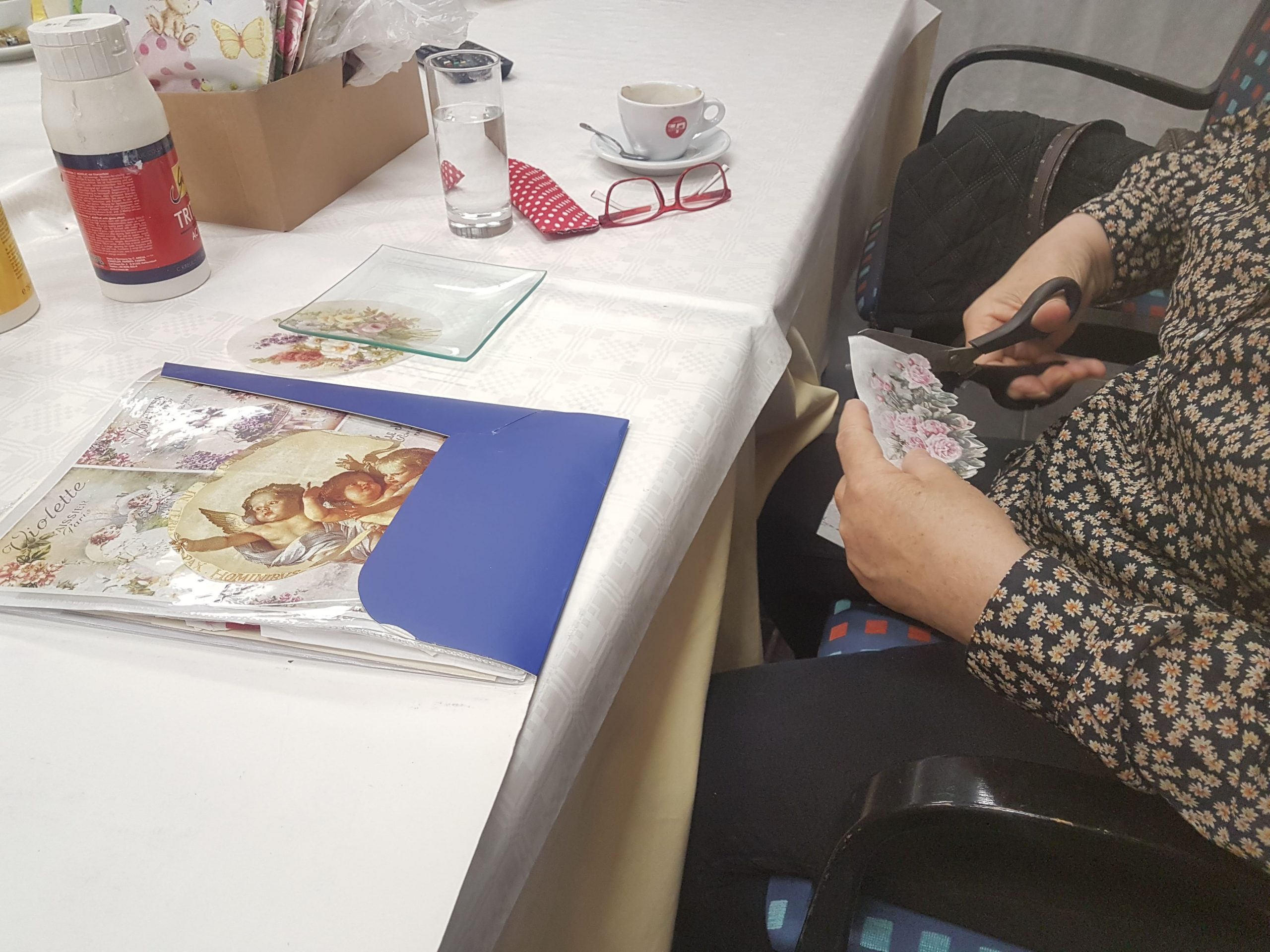 Na današnjoj kreativnoj radionici pojedini sudionici su završavali svoje kreacije dok su neki pripremali ukrase za sljedeću radionicu te izrađivali nove stvari. Rezanje motiva sa salveta izrazito je važno pripremiti da bi se sljedeća radionica mogla odvijati prema planu i programu. Ostali sudionici su crtali konturnim bojama na staklenim podlogama.