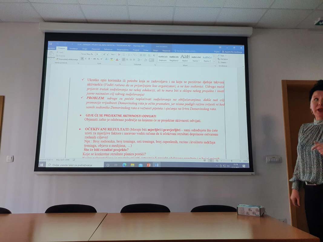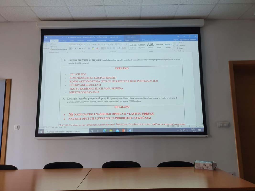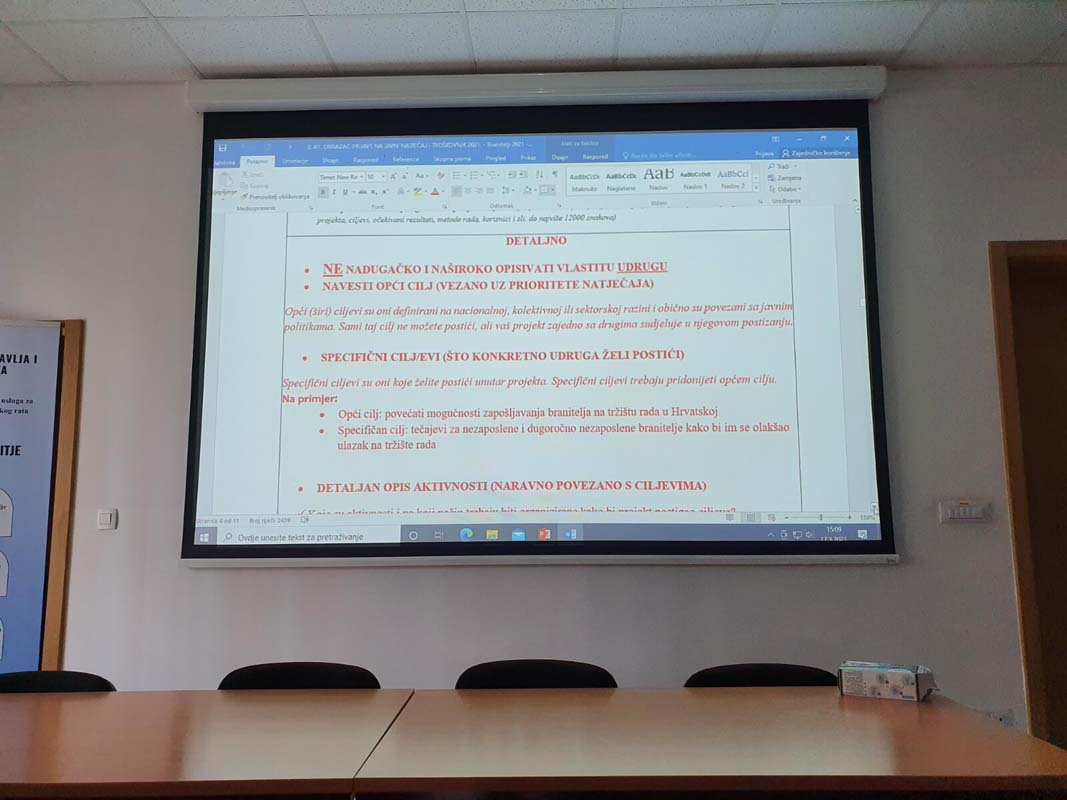 Radionica se sastojala od najave natječaja i javnog poziva za 2021., općih uvjeta financiranja, uputa za prijavitelje te pripreme opisnog i financijskog izvještaja. Radionica je održana uz pridržavanje svih epidemioloških mjera i odredbi propisane socijalne distance uz ograničen broj polaznika.