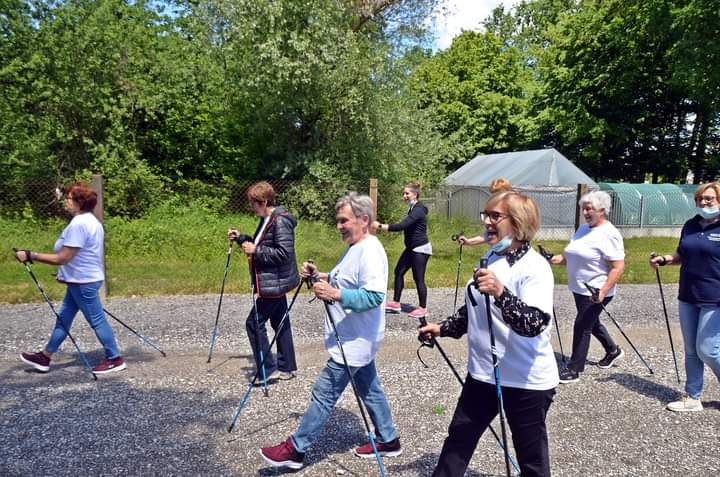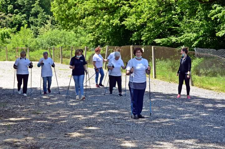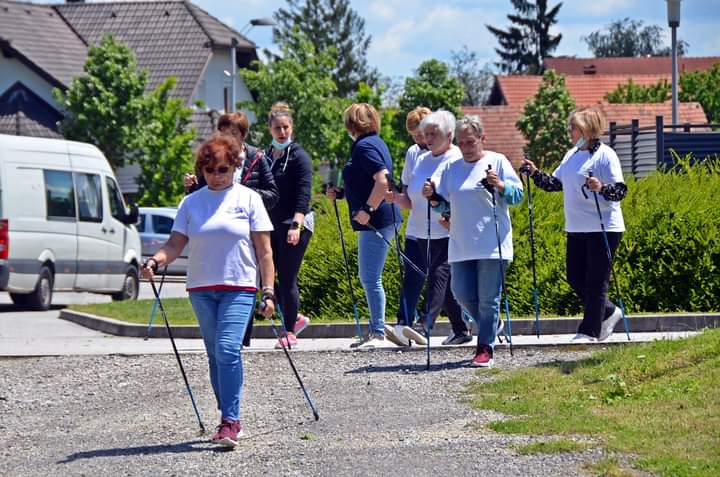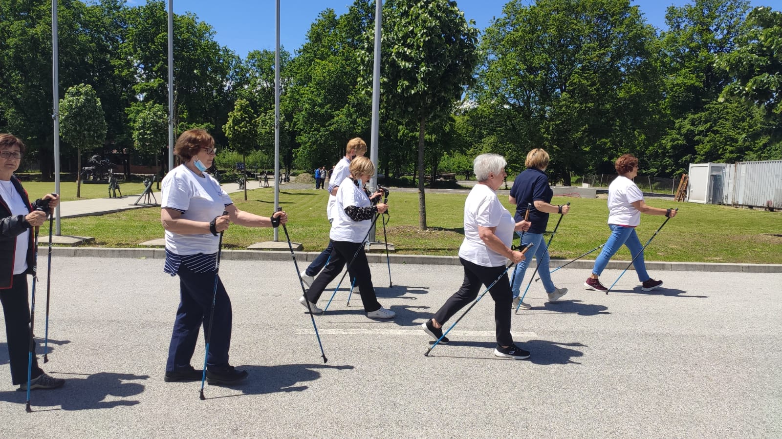 No, prije samog početka potrebno je naše sudionike upoznati sa pravilima nordijskog hodanja te ih naučiti kako koristiti štapove. Krenuli smo sa laganim zagrijavanjem i razgibavanjem tijela. Nakon zagrijavanja učili smo osnovnu tehniku; naizmjenični pokret ruku i štapova prema naprijed i zamah rukom suprotnom od noge koja je naprijed(desna ruka-lijeva noga). Intenzitet hodanja je prilagođen starijoj populaciji te smo nakon treninga radili vježbe istezanja i opuštanja mišića.